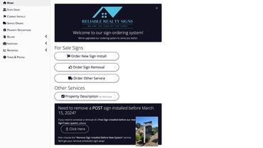 As professionals in real estate for a combined 40+ years, we saw a need for a seamless way for realtors and brokerages to order their listing signs, accessories, and posts. We have a modern-day ordering system so that your needs are met in an easy, trackable manner. Our goal is for YOU to be able to order what you need, when you need it, and make it EASY. With Reliable Realty Signs, you can have confidence that our signposts are stored indoors and delivered promptly and in excellent condition. Our system provides online ordering for scheduling, delivery, standard riders, custom riders, QR Codes, solar lights, brochure boxes, post-installation, removal, invoicing, and updates every 2-3 months about your active rentals. We represent you, and you represent us. We understand the value of professionalism and meeting client needs, timely, consistently, and with 100% satisfaction.