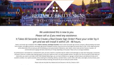 We make sure our stock and custom riders match your brokerage colors. To begin initial ordering for your brokerage and arrange for your no cost sign storage, please contact us at 707-710-9474 or send an email to ReliableRealtySigns@gmail.com. Once we finish adding your information, you will receive a login for our website and we can now accept your sign installation orders.